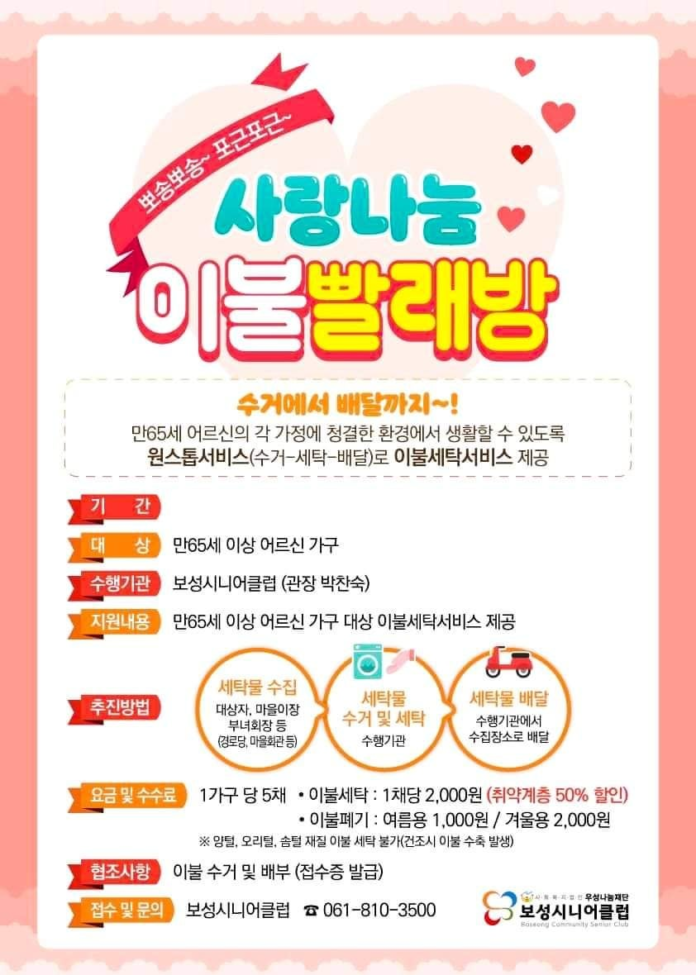 이불 세탁 서비스 관련 문의는 보성시니어클럽(061-810-3500)으로 하면 된다.