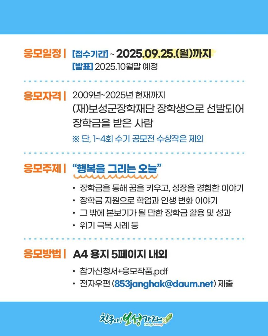 보성군장학재단이 장학금 혜택을 받은 학생들의 성장 이야기와 경험을 공유하기 위한 ‘제5회 장학생 수기 공모전’을 연다.
