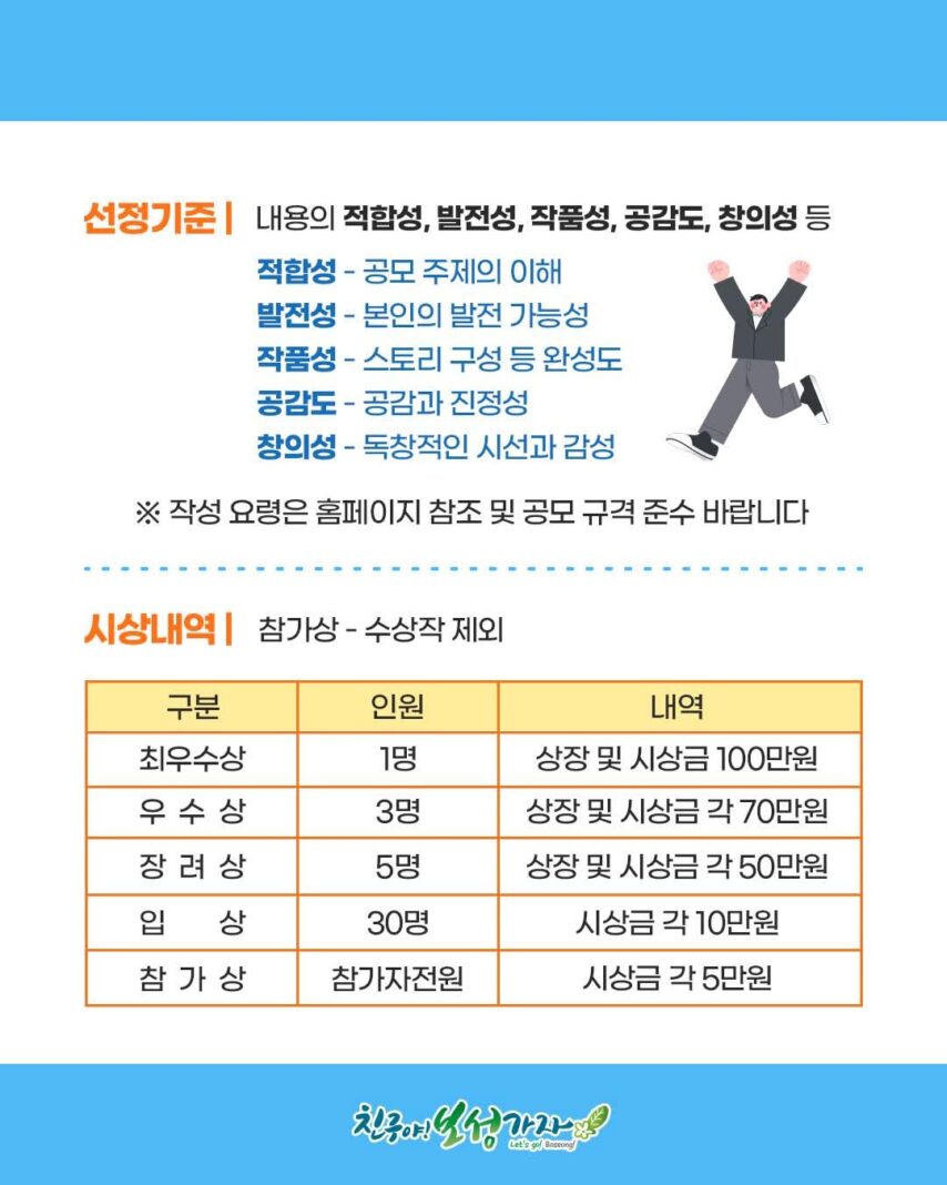 시상은 △최우수상 1명(100만 원) △우수상 3명(각 70만 원) △장려상 5명(각 50만 원) △입상 30명(각 10만 원) △참가상(전원 5만 원)으로, 총 1000만 원 규모의 상금이 지급된다. 심사는 적합성·발전성·공감도·창의성 등을 기준으로 진행되며, 결과는 10월 중 재단 홈페이지에 게시된다.