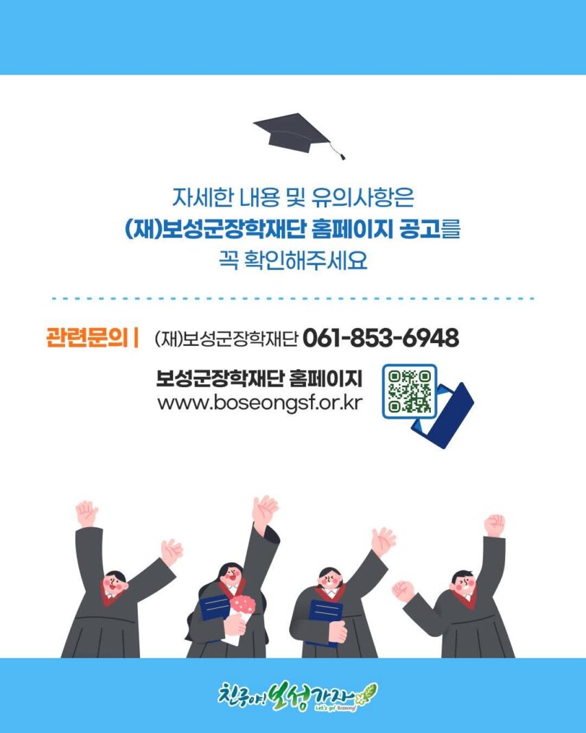 자세한 사항은 보성군장학재단 홈페이지(www.boseongsf.or.kr) 또는 전화(061-853-6948)로 문의하면 된다.
