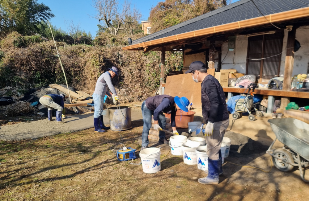 오랜 기간 패이고 울퉁불퉁해진 마당은 보행 시 넘어질 위험이 컸고, 기울어진 대문 역시 여닫기 어려워 일상 속 불편이 지속돼 왔다. 이를 들은 봉사단체 회원들은 모래를 나르고 시멘트를 개며 미장 작업을 정성껏 진행했고, 주변 정리와 함께 대문도 바로잡아 안전한 생활환경을 마련했다.
