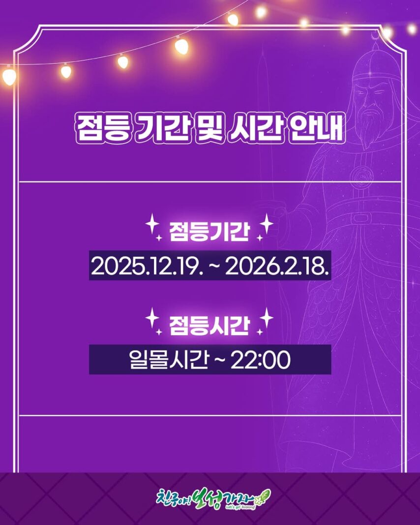빛 점등은 12월 19일부터 2026년 2월 18일까지 진행되며, 매일 일몰 후부터 밤 10시까지 운영된다.
