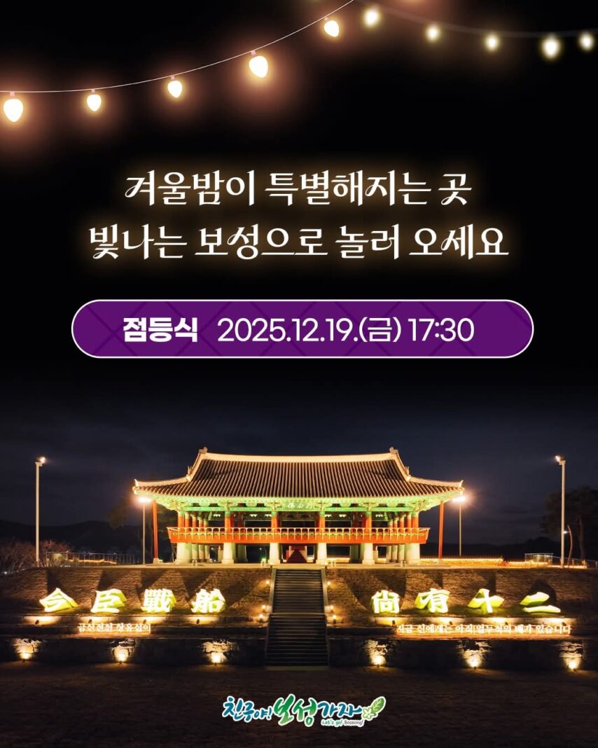 보성군은 오는 19일 오후 5시 30분, 열선루 이순신 역사문화공원에서 ‘2025 보성 열선루 이순신 역사문화공원 빛 점등식’을 개최하고 겨울철 야간 경관 조명 운영에 들어간다고 밝혔다.