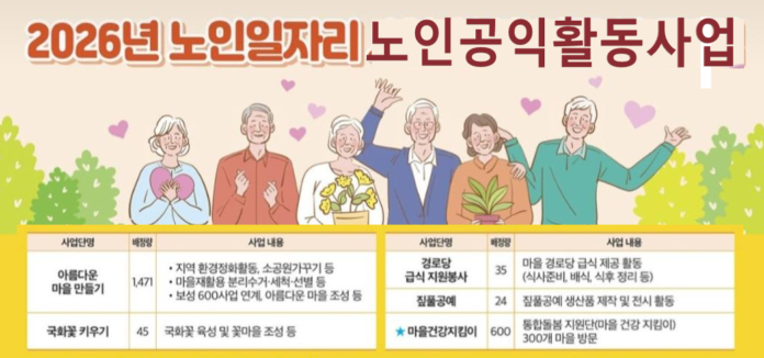 2026년 노인공익활동사업은 ▲아름다운 마을 만들기 ▲국화꽃 키우기 ▲경로당 급식 지원봉사 ▲짚풀공예 ▲마을건강지킴이 등 총 5개 사업단으로 구성됐다.