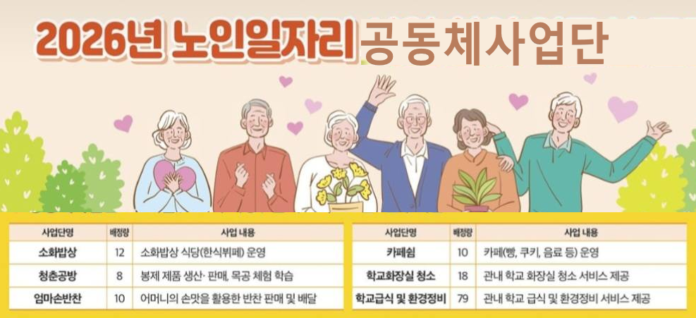 2026년 공동체사업은 ▲소화밥상 ▲청춘공방 ▲엄마손반찬 ▲카페쉼 ▲학교화장실 청소 ▲학교급식 및 환경정비 등 총 6개 사업단, 132명의 어르신 참여로 운영된다.