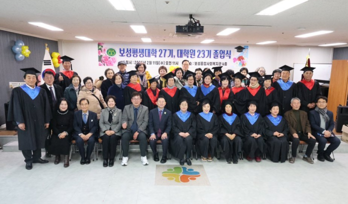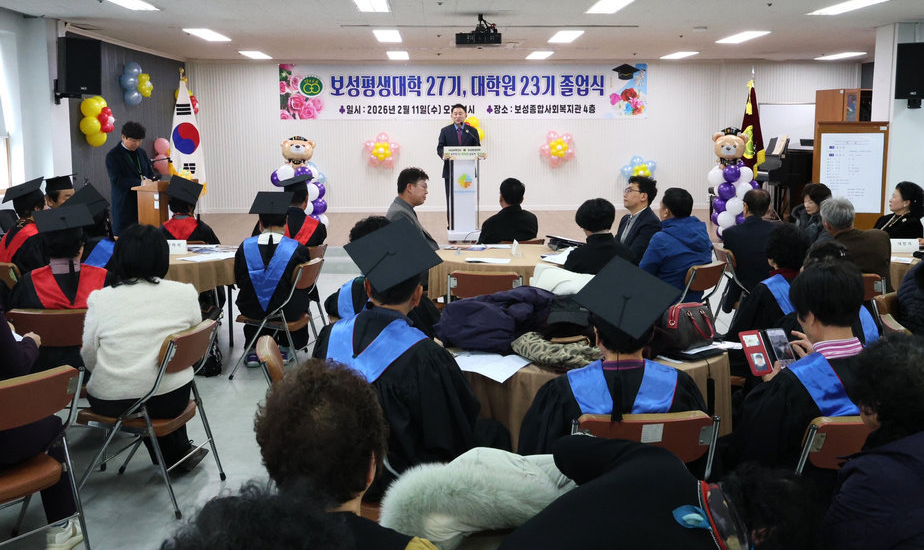 지난 11일 ‘보성군’에 따르면, 보성군은 이날 보성종합사회복지관 대강당에서 지역 대표 평생교육기관인 ‘보성평생대학(원)'(학장 김진문)의 2026년 졸업식을 개최했다. ‘삶을 배우는 배움, 보성에서 꽃피다’라는 주제로 열린 행사에는 졸업생과 가족, 자원봉사자 등 60여 명이 참석했다.
