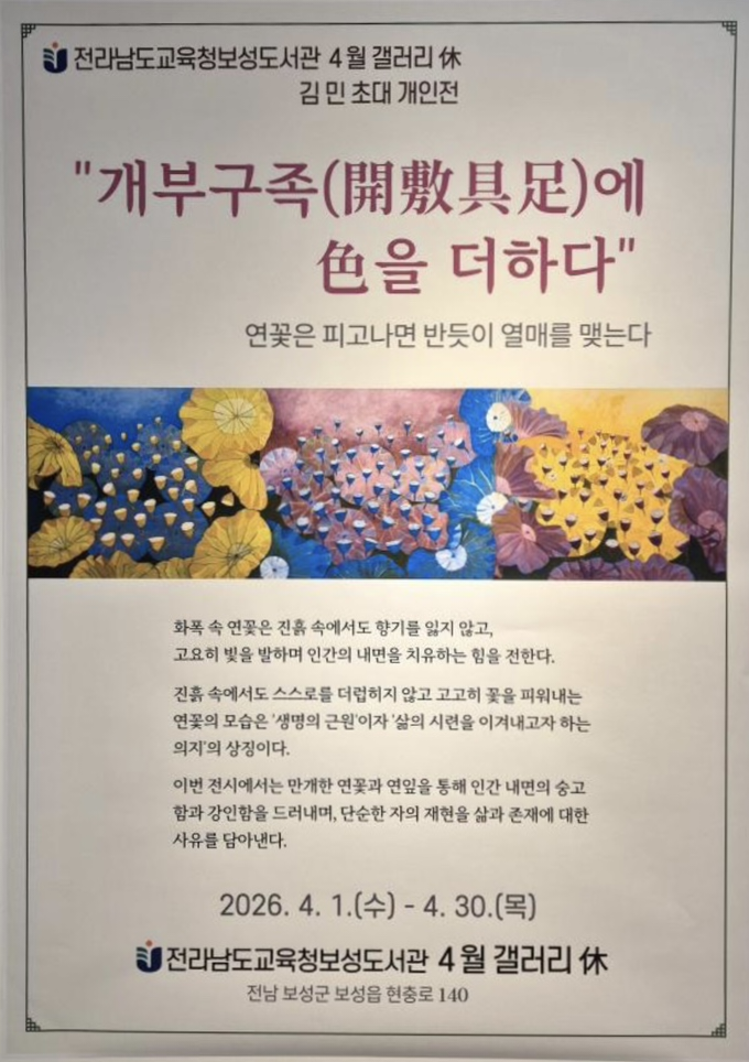 전라남도교육청보성도서관은 4월 한 달 동안 보성도서관 갤러리 休에서 김민 작가 초대 개인전 ‘개부구족(開敷具足)에 색을 더하다’를 개최한다.