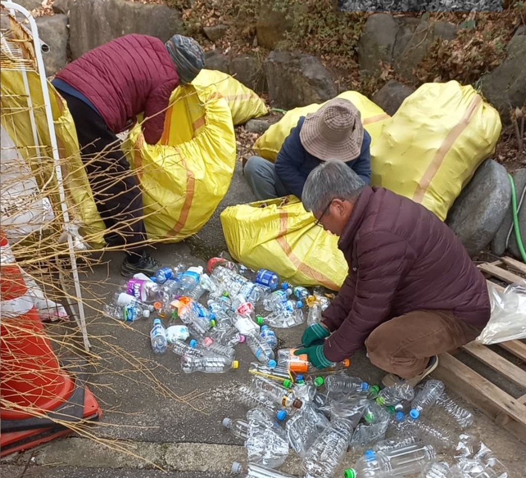 보성시니어클럽 자원순환지도자 어르신들이 수거한 폐페트병을 분류하고 정리하며 재활용 활동을 펼치고 있다. 작은 실천으로 깨끗한 마을을 만들어가는 현장의 모습이다. 사진=보성시니어클럽