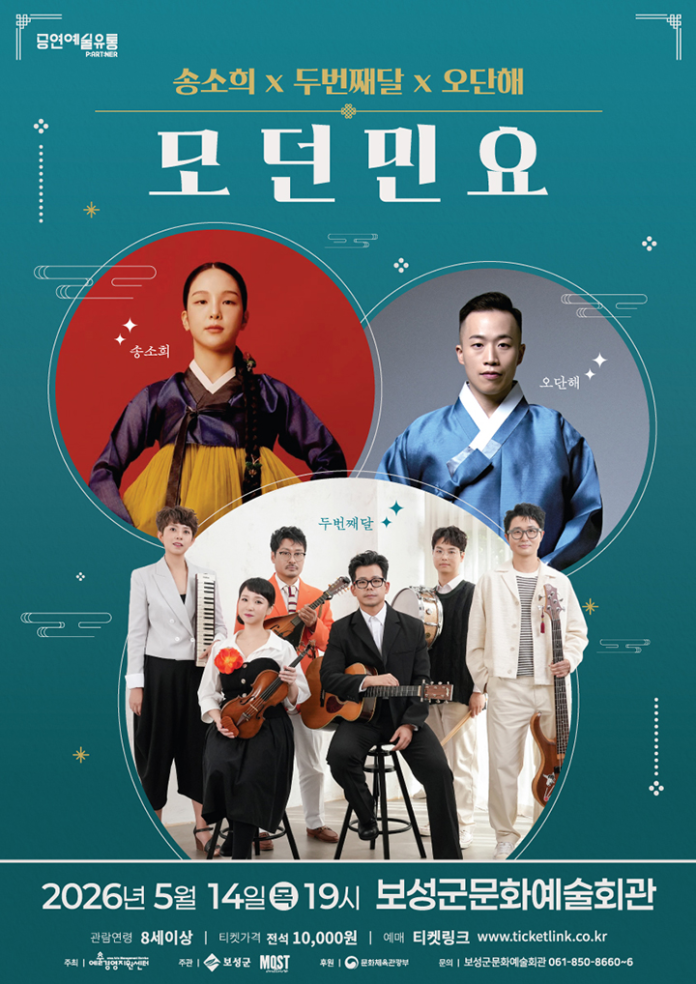 무대에는 소리꾼 송소희와 오단해, 그리고 월드뮤직 그룹 ‘두번째달’이 참여해 완성도 높은 협업 공연을 선보일 예정이다. 출연진들은 전통 민요를 기반으로 다양한 장르를 접목한 새로운 스타일의 무대를 통해 전통 음악의 새로운 가능성을 제시할 계획이다.