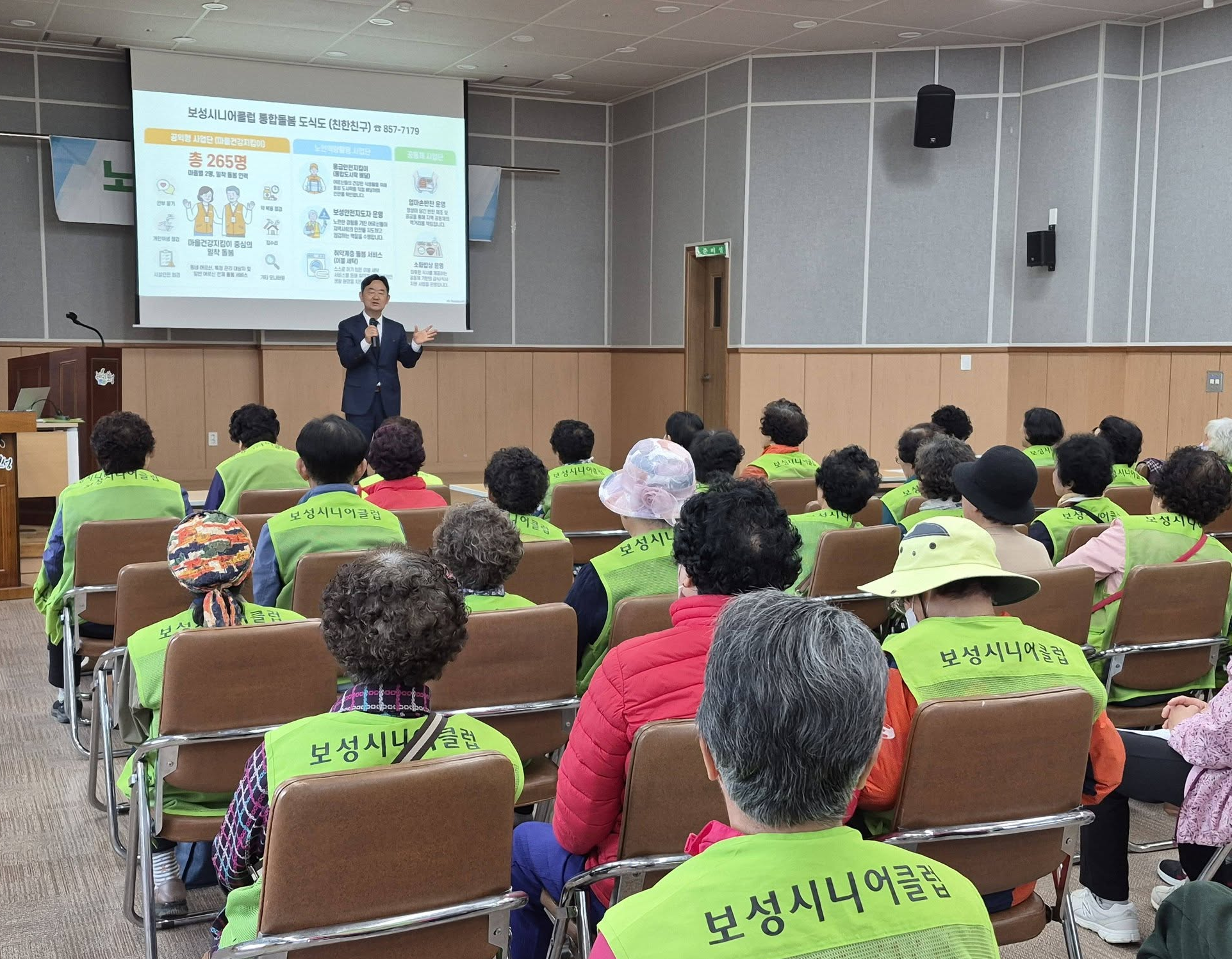 보성군청 사회복지과 박경배 팀장이 ‘마을건강지킴이’ 사업 안내를 하고 있다. 이번 교육은 어르신들의 건강과 안부를 살피는 역할을 되새기고, 현장에서 필요한 실무 역량을 강화하기 위해 마련됐다. 사진=보성시니어클럽