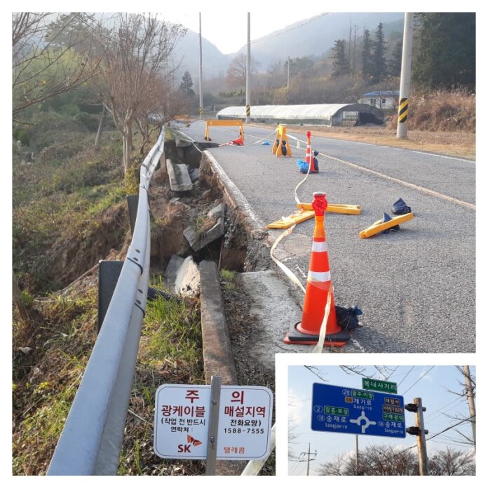 복내면 개기로의 유실된 도로를 지나는 운전자들이 사고 위험에 노출되고 있다.
