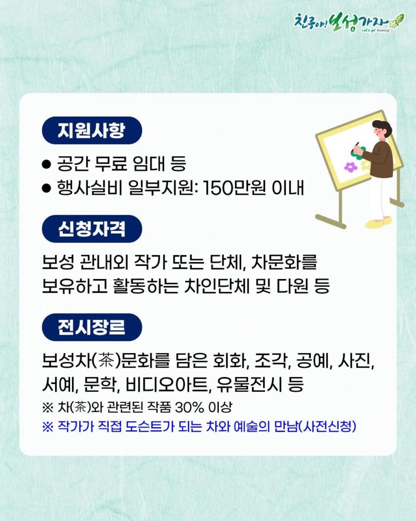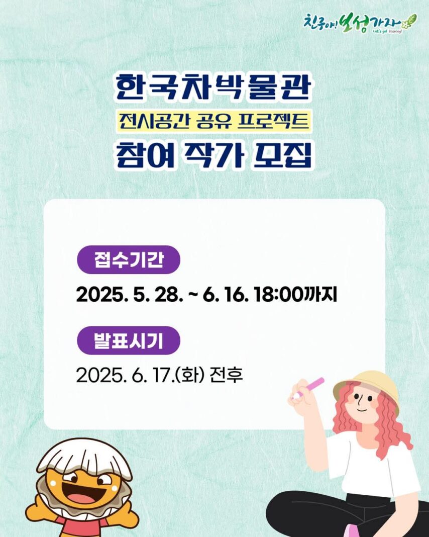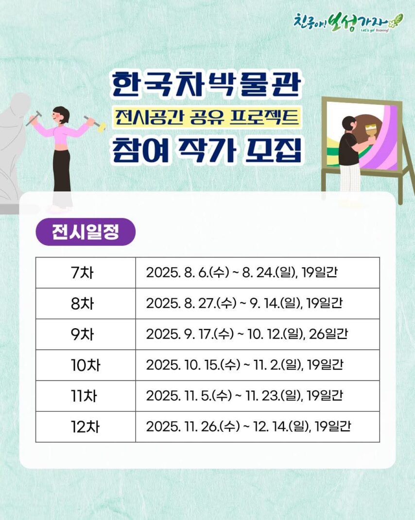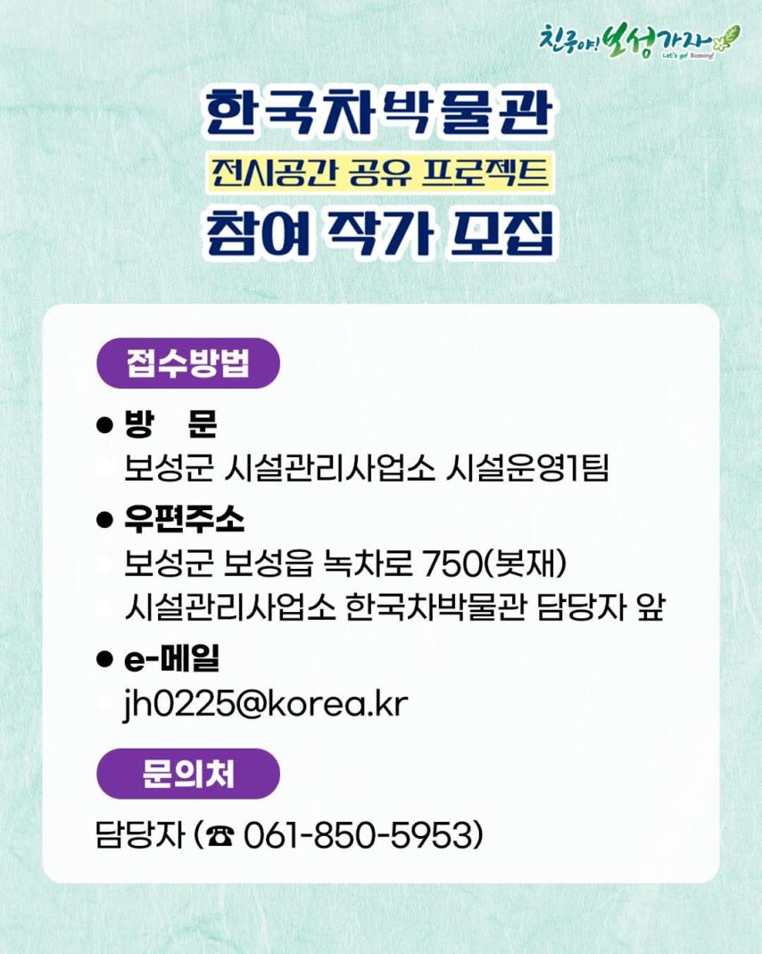 보성군이 지역 작가들에게 전시 기회를 제공하고, 보성의 차(茶)문화와 예술의 융합을 통해 문화 관광 활성화를 도모하고자 ‘2025년 한국차박물관 전시공간 공유 프로젝트’ 참여 작가 및 단체를 추가 모집한다.