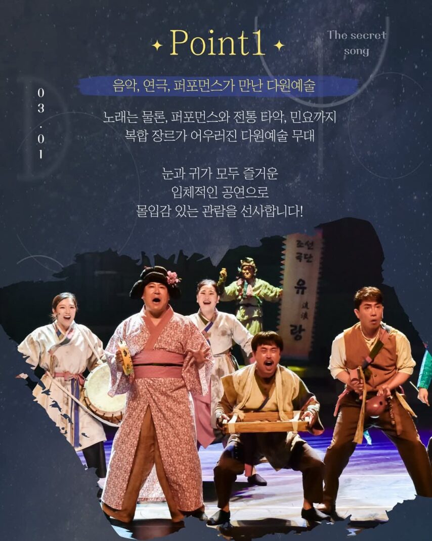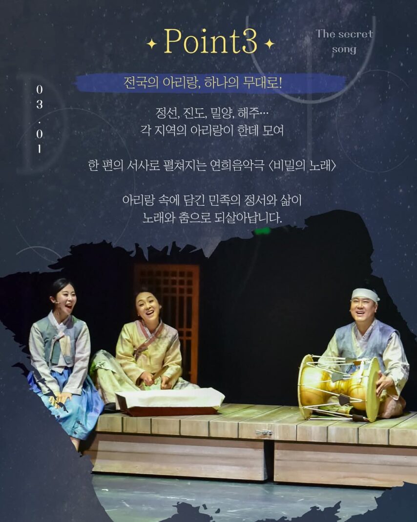 이 과정에서 전통문화, 풍자, 해학이 어우러져 관객에게 웃음과 감동을 함께 선사할 예정이다. 17명의 배우가 무대에 올라 전국 각지의 아리랑과 민속공연 요소를 결합해 웅장하고 흥미로운 장면을 연출할 것으로 기대된다.