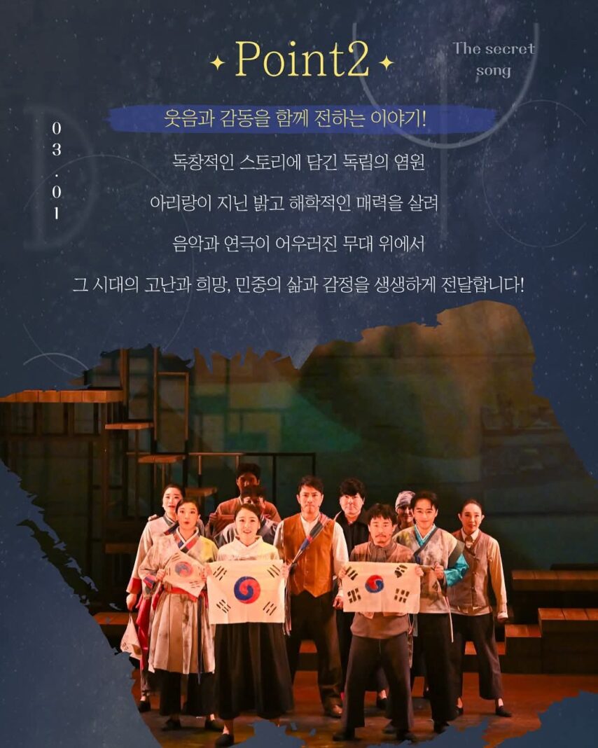 공연은 유랑극단 단장 ‘만석’과 소리꾼 ‘기목’이 등장해 일제의 감시 속에서 아리랑을 이용해 독립운동 정보를 전달하는 과정을 중심으로 전개된다.