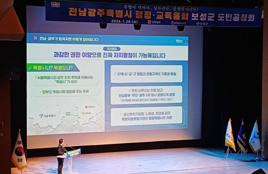 행사는 보성군수의 환영 인사말을 시작으로, 전라남도지사와 전라남도교육감이 참석해 통합특별시의 행정·교육 지원 방향과 행정통합의 필요성 및 당위성에 대해 설명했다. 이어 행정통합 추진 방안 발표와 전문가 및 관계자 질의응답, 군민 자유 의견수렴 순으로 진행됐다.