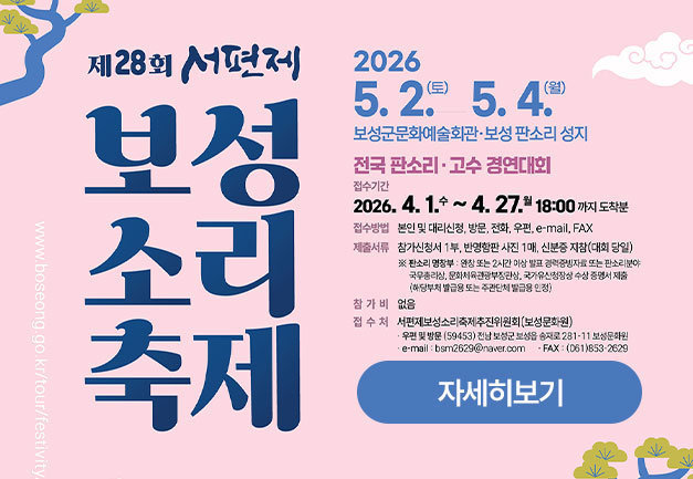 보성군이 오는 5월 2일부터 4일까지 개최되는 ‘제28회 서편제 보성소리축제’의 대표 프로그램인 전국 판소리·고수 경연대회 참가자를 모집한다.