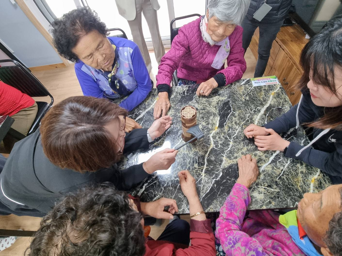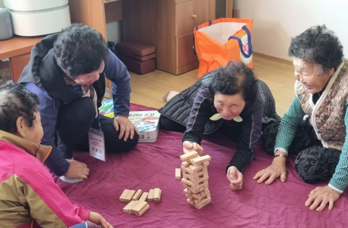 율어면 양지경로당에서 어르신들이 보드게임에 참여해 블록을 쌓으며 집중력과 협동심을 키우고 있다. 서로 응원하며 웃음이 이어지는 가운데, 즐거운 놀이 속에서 활기찬 여가 시간을 보내고 있다.사진 = 보성시니어클럽